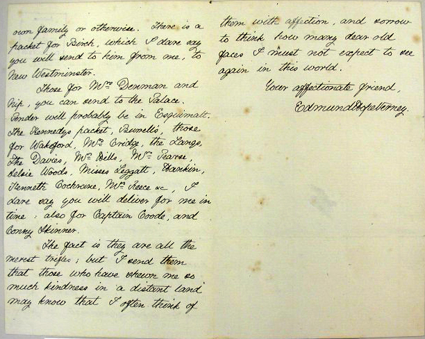 The first paragraph of Verney's letter to the McKenzies, preserved in the BC Archives, reads: "Herewith I send numerous little Christmas and New Year remembrances to some of my friends. If any of them feel offended or insulted at my sending such trumpery things from England, as I am too far off to be kicked, ask them to do it by proxy: Kenneth will act for me."