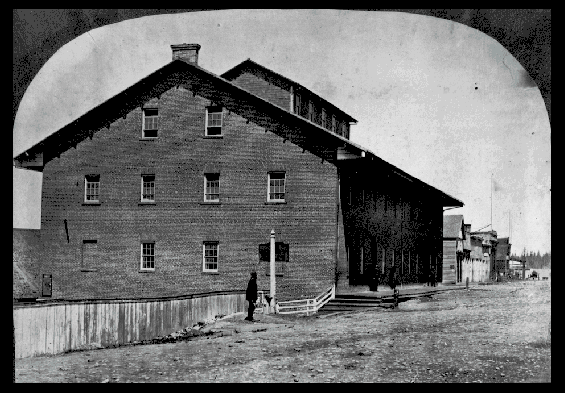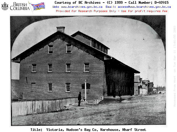 Hudson Bay Company Store and Warehouse While Fort Victoria was dismantled in the 1860s, the Hudson’s Bay Company still maintained an important role in the commercial life of Victoria through to the 1880s. With the gold rush, commercial wholesale and retail trade increased in significance for the company. To meet new levels of demand brought by the gold rush, the Hudson’s Bay Company required new quarters. Consequently, the company built a red brick store and warehouse on Wharf Street in 1859. Even though the Hudson’s Bay Company no longer dominated trade and supply in Victoria, they were still important in the business life of the city as is evidence by the size and prominence of their building Wharf Street. The building was five stories tall with a basement and sub-basement as well as a high slate roof. The brick walls were twenty-two inches thick and the beams were hand-hewn Douglas fir. In Book of Small, Emily Carr recalled seeing the natives coming across the harbour in their canoes to trade at the store and described the building as “…a long, low building of red brick with a veranda."46 A publication by the Hudson’s Bay Company marking the centenary of Fort Victoria noted that those who designed the building accounted for the possibility that the gold rush might pass and Victoria would return to its former ‘primitive wilderness.’ To prepare for this possible occasion, the sub-basement was equipped with ammunition and supplies in case of an attack by the local Aboriginal population. The building also housed an underground escape tunnel.47 The building was taken down and a new building was constructed in 1912 at its current location on Douglas Street as a modern department store.48 |